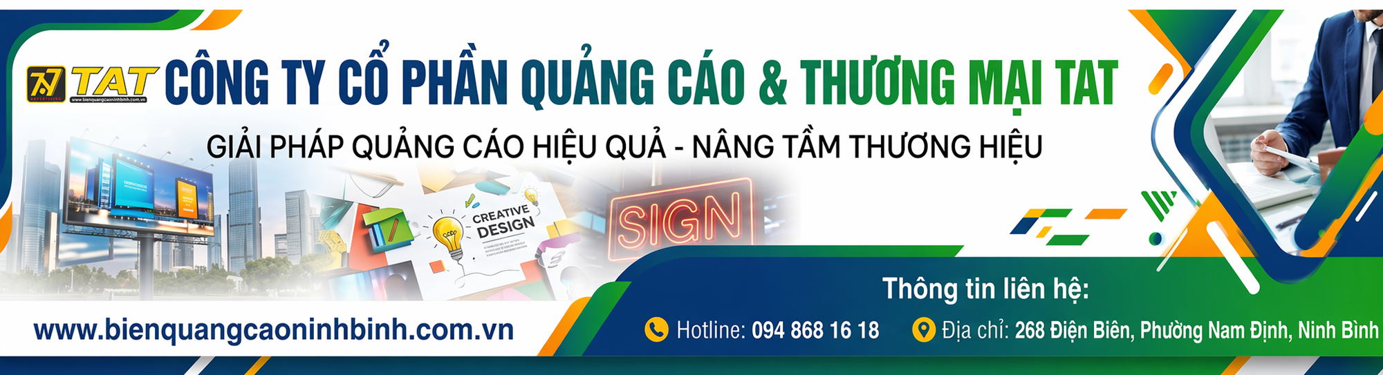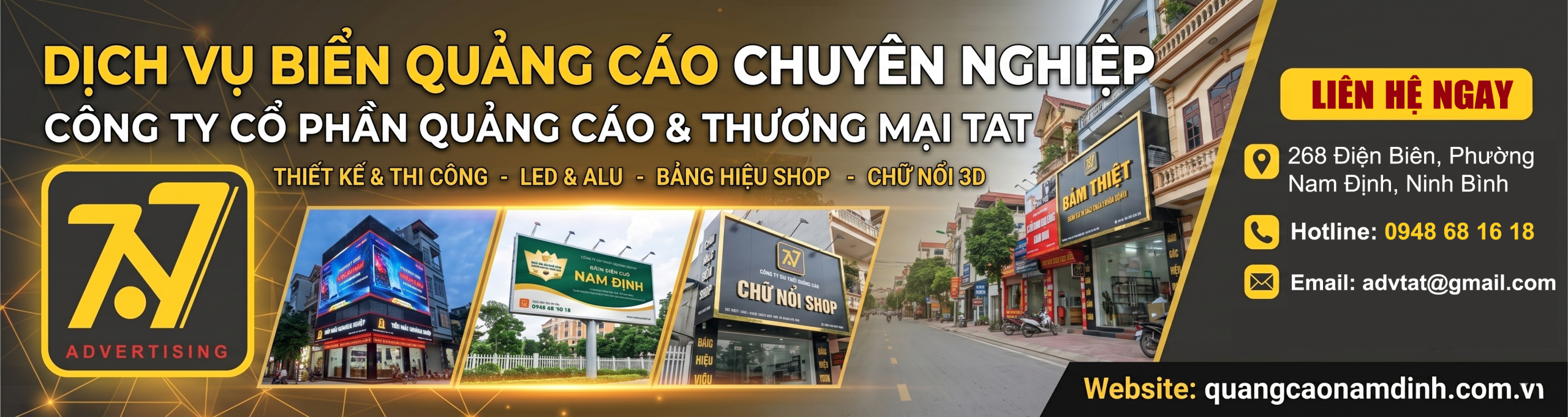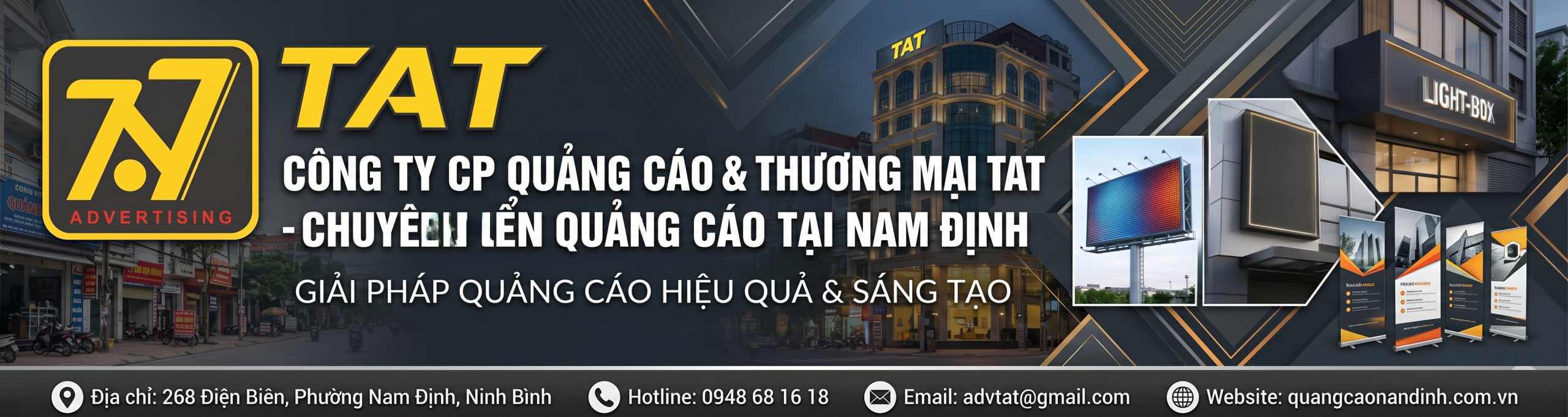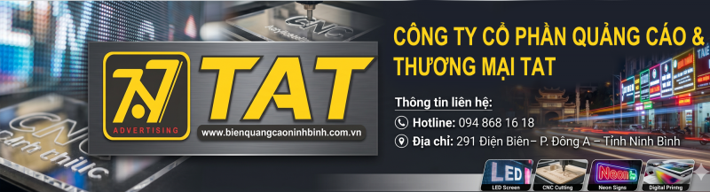 Là một trong những đơn vị uy tín tại Nam Định, chuyên cung cấp các giải pháp quảng cáo tổng thể từ thiết kế, sản xuất đến thi công hoàn thiện. Với trụ sở đặt tại 291 Điện Biên – P. Đông A – Tỉnh Ninh Bình, TAT không chỉ phục vụ khách hàng trong khu vực mà còn mở rộng hợp tác với nhiều đối tác trên toàn quốc, mang đến những sản phẩm quảng cáo chất lượng cao, đáp ứng đa dạng nhu cầu của doanh nghiệp.